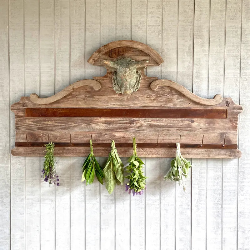 In our travels we are often inspired by vintage antique pieces, our Charcuterie rack is one of those pieces. Great for hanging cutting boards, dried herbs or even Christmas stockings.