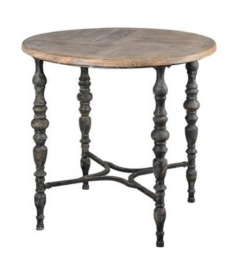 Jefferson Accent Table - This accent table exudes vintage charm with its beautifully crafted fir wood top, featuring a subtle herringbone pattern that adds depth and texture. The round design is supported by four intricately turned metal legs finished in a distressed black tone, lending an antique-inspired appeal. A gracefully curved metal stretcher enhances both the structure and character of the piece. With its versatile size and vintage aesthetic, this table is perfect as a bistro-style dining table, entryway statement piece, or a unique side table in any living space.