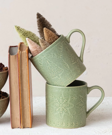 This debossed stoneware mug with a matte reactive glaze in green is a unique and stunning addition to any dining experience. Each mug features a round shape and a green color scheme, with each mug featuring a different debossed design. The mug comes in 2 styles. Made of stoneware, they have a matte finish and smooth texture. The reactive glaze allows for slight variations in color and appearance, making each a one-of-a-kind piece. These mugs can be used for serving hot or cold beverages or as a decorative piece. They measure 4 inches in diameter and 4 inches in height, with a capacity of 16 ounces. They're perfect for everyday dining and entertaining, or as a thoughtful gift for loved ones. Each one will vary. A perfect choice for seasonal dining, or a thoughtful gift for loved ones.