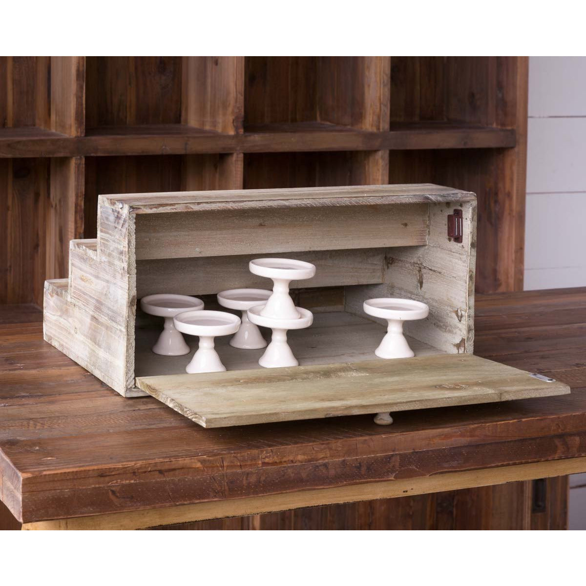 Featuring reclaimed wood, this stair step platform is ideal for displaying a wide variety of items, from freshly baked goods to candles. Door in back offers convenient storage.